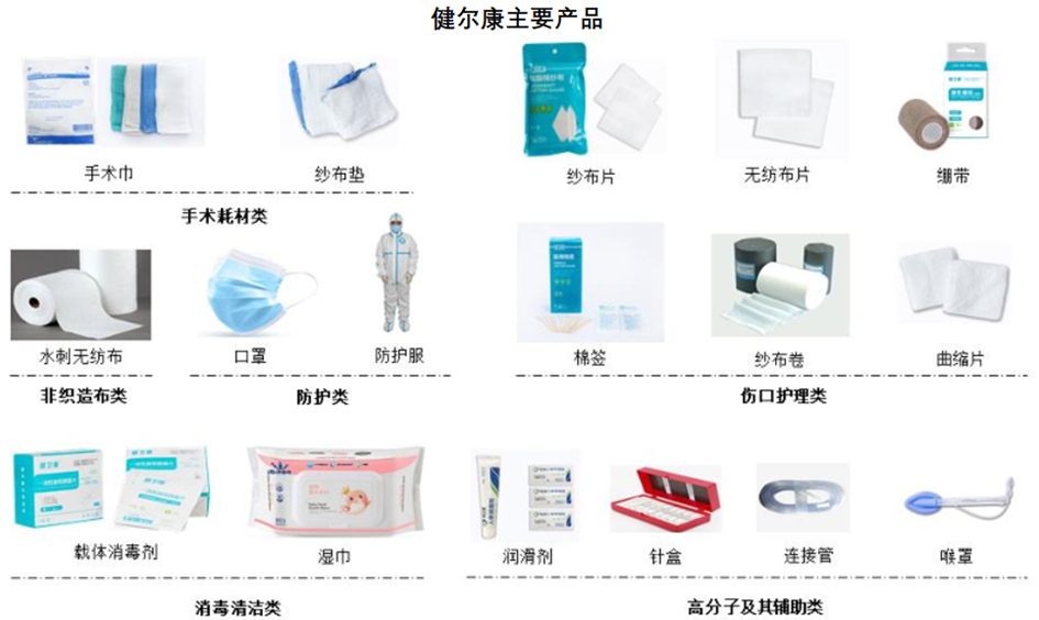经过多年积累,健尔康产品线覆盖手术耗材类、伤口护理类、消毒清洁类、防护类、高分子及辅助类和非织造布类等产品。