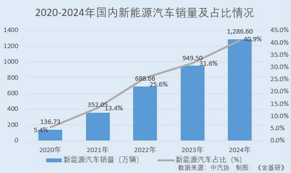 据中汽协数据,2020-2024年,国内新能源汽车销量分别为136.73万辆、352.05万辆、688.66万辆、949.50万辆、1,286.60万辆,CAGR达75.14%。同期,国内新能源汽车市场渗透率分别为5.4%、13.4%、25.6%、31.6%、40.9%。