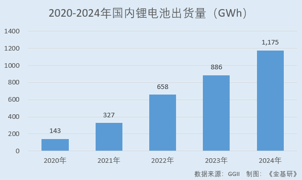 在新能源汽车及储能产业的带动下,近年来国内锂电池出货量高速增长。据GGII数据,2020-2024年,国内锂电池出货量分别为143GWh、327GWh、658GWh、886GWh、1,175GWh,年均复合增长率达69.31%。