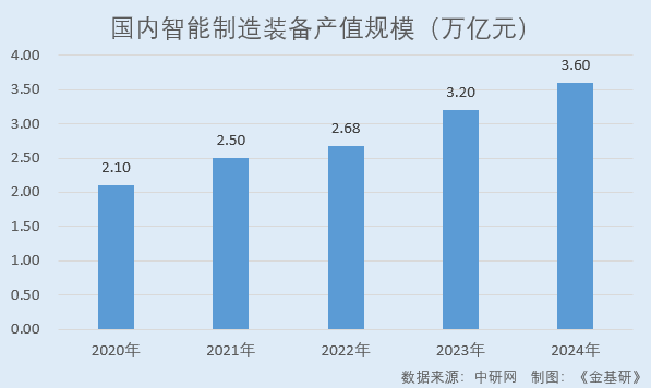 据中研网数据,2020-2024年,国内智能制造装备产值规模2.10万亿元、2.50万亿元、2.68万亿元、3.20万亿元、3.60万亿元,近五年CAGR达14.42%。