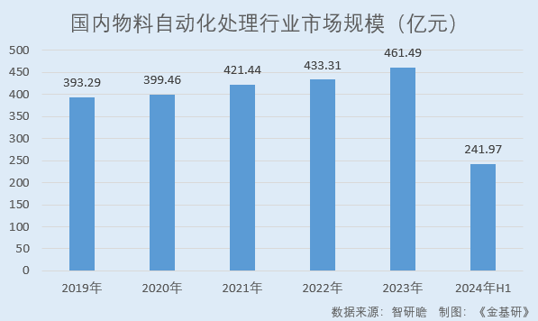 据智研瞻数据,2019-2023年及2024年H1,国内物料自动化处理行业市场规模分别为393.29亿元、399.46亿元、421.44亿元、433.31亿元、461.49亿元、241.97亿元。其中,2024年上半年,国内物料自动化处理行业市场规模同比增长4.87%。