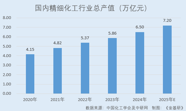 据中国化工学会及中研网数据,2020-2024年,国内精细化工行业总产值分别为4.15万亿元、4.82万亿元、5.37万亿元、5.86万亿元、6.50万亿元,近五年CAGR为11.87%。中研网预计2025年国内精细化工行业总产值达7.20万亿元。