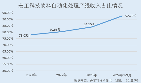据招股书,2021-2023年及2024年1-9月,宏工科技物料自动化处理产线收入分别为4.49亿元、17.46亿元、26.77亿元、13.47亿元,占当期主营业务收入的比例分别为78.05%、80.55%、84.15%、92.79%。
