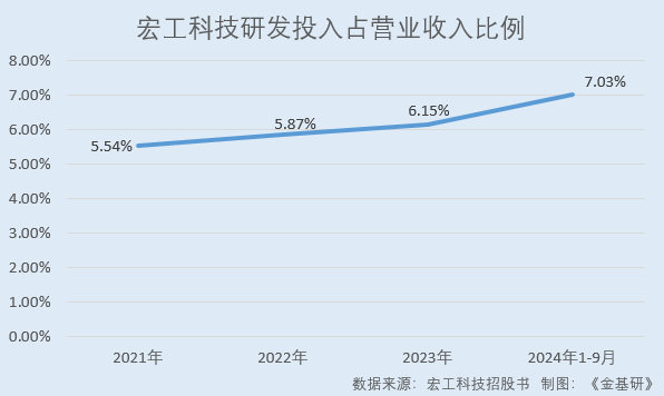 据招股书,2021-2023年及2024年1-9月,宏工科技研发投入分别为0.32亿元、1.28亿元、1.97亿元、1.03亿元,占当期营业收入比例分别为5.54%、5.87%、6.15%、7.03%。