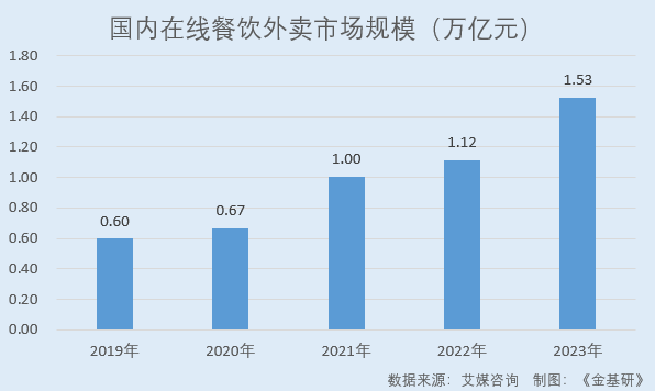 另据iiMedia Research(艾媒咨询)数据,2019-2023年,国内在线餐饮外卖市场规模分别为0.60万亿元、0.67万亿元、1.00万亿元、1.12万亿元、1.53万亿元,年均复合增长率达26.38%,预计到2027年,国内在线餐饮外卖市场规模将达到1.96万亿元,行业渗透率有望达30.4%。