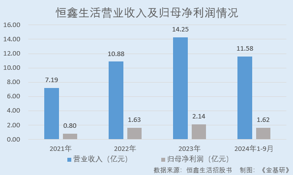 据招股书,2021-2023年,恒鑫生活的营业收入分别为7.19亿元、10.88亿元、14.25亿元,年均复合增长率为40.79%;归母净利润分别为0.80亿元、1.63亿元、2.14亿元,年均复合增长率达63.34%。