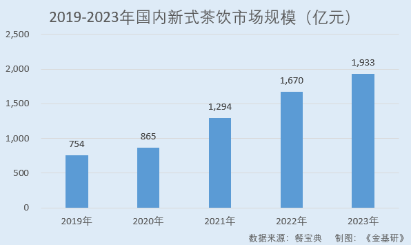 据餐宝典数据,2019-2023年,国内新式茶饮市场规模分别为754亿元、865亿元、1,294亿元、1,670亿元、1,933亿元,年均CAGR达26.54%。随着消费场景更加多元化,新式茶饮消费市场前景广阔。