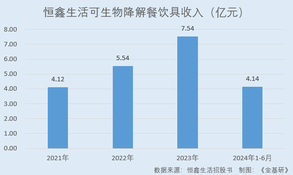据招股书,2021-2023年及2024年1-6月,恒鑫生活可生物降解餐饮具收入分别为4.12亿元、5.54亿元、7.54亿元、4.14亿元,2022-2023年年均复合增长率达35.29%。