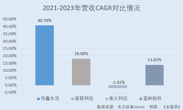 据东方财富choice数据,2021-2023年,恒鑫生活同行业可比公司宁波家联科技股份有限公司(以下简称“家联科技”)的营收CAGR为18.08%;福建南王环保科技股份有限公司(以下简称“南王科技”)的营收CAGR为-1.92%;富岭科技股份有限公司(以下简称“富岭股份”)的营收CAGR为13.83%。因厦门泉舜纸塑容器股份有限公司(以下简称“泉舜纸塑”)未披露2023年财务数据,故未作比较。
