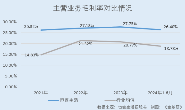 据招股书,2021-2023年及2024年1-6月,恒鑫生活的主营业务毛利率分别为26.32%、27.13%、27.75%、26.40%。