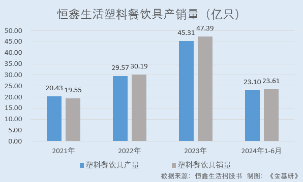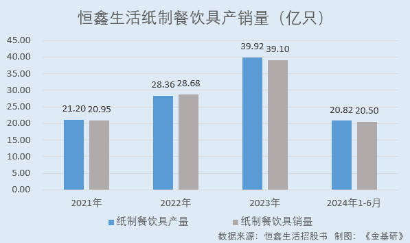 据招股书,2021-2023年及2024年1-6月,恒鑫生活纸制餐饮具产量分别为21.20亿只、28.36亿只、39.92亿只、20.82亿只,销量分别为20.95亿只、28.68亿只、39.10亿只、20.50亿只。