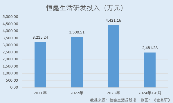 据招股书,2021-2023年及2024年1-6月,恒鑫生活研发投入分别为3,215.24万元、3,590.51万元、4,421.16万元、2,481.28万元,累计研发投入金额为11,226.91万元,占累计营业收入的比例为3.47%。