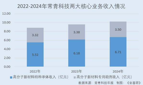 据常青科技年报数据,2022-2024年,常青科技高分子新材料特种单体业务收入分别为5.52亿元、6.18亿元、6.71亿元,高分子新材料专用助剂收入分别为3.32亿元、3.38亿元、3.50亿元。