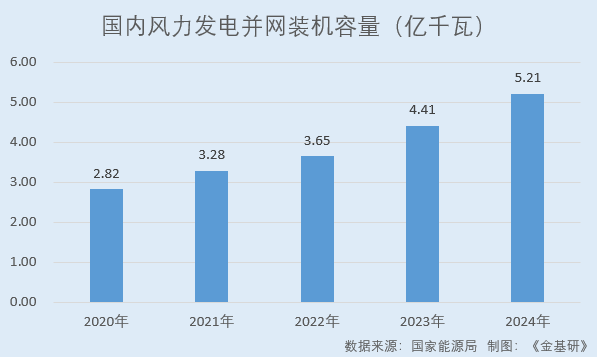 据国家能源局数据,2020-2024年,国内风力发电并网装机容量分别为2.82亿千瓦、3.28亿千瓦、3.65亿千瓦、4.41亿千瓦、5.21亿千瓦,年均复合增长率为16.59%。
