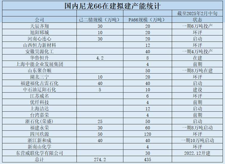 在国家政策的大力支持下,国内多家企业经长期研发取得了己二腈生产工艺的重大成果,开始了己二腈生产线的投资建设。截至2025年2月中旬的统计数据显示,国内尼龙66在建拟建产能高达435万吨,市场需求空间广阔。