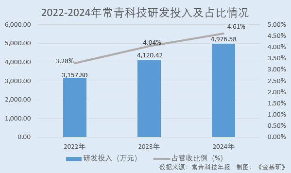 据常青科技年报数据,2022-2024年,常青科技研发投入分别为3,157.80万元、4,120.42万元、4,976.58万元,占当期营业收入的比例分别为3.28%、4.04%、4.61%。近三年,常青科技研发投入CAGR达25.54%。