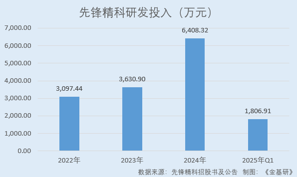 近年来,先锋精科持续加大在技术研发投入力度,全力推动技术突破与升级。2022-2024年及2025年一季度,先锋精科的研发投入分别为3,097.44万元、3,630.90万元、6,408.32万元、1,806.91万元。其中,2022-2024年,先锋精科的研发投入CAGR达43.84%;2025年一季度,先锋精科的研发投入同比增长50.71%。