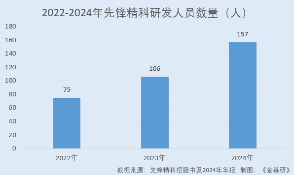 2022-2024年,先锋精科拥有研发人员数量分别为75人、106人、157人,占员工总数的比例分别为12.34%、14.93%、13.01%。