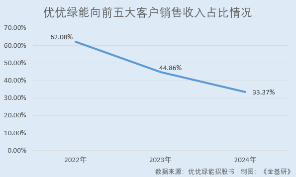 据招股书,2022-2024年,优优绿能向前五大客户的销售收入占营业收入比重分别为62.08%、44.86%、33.37%。