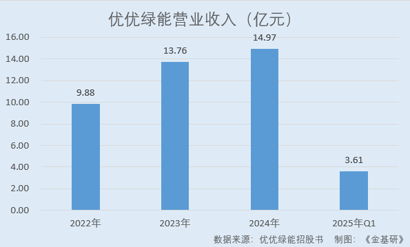 据招股书,2022-2024年及2025年一季度,优优绿能的营业收入分别为9.88亿元、13.76亿元、14.97亿元、3.61亿元,最近三年复合增长率为23.12%。需要说明的是,优优绿能2025年一季度财务数据经致同会计师事务所审阅未审计,下同。