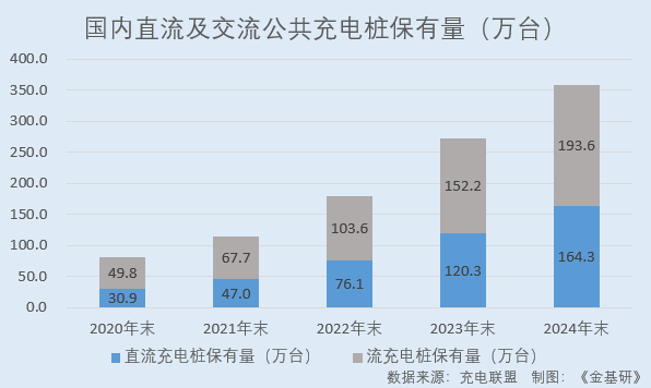 另据充电联盟数据,2020-2024年各期末,国内公共直流充电桩保有量分别为30.9万台、47.0万台、76.1万台、120.3万台、164.3万台,CAGR达51.85%;国内公共交流充电桩保有量分别为49.8万台、67.7万台、103.6万台、152.2万台、193.6万台,CAGR为40.42%;国内公共直流充电桩保有量占比分别为38.29%、40.98%、42.35%、44.15%、45.91%。