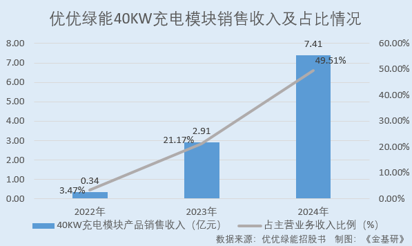 据招股书,2022-2024年,优优绿能的40KW充电模块销售收入分别为0.34亿元、2.91亿元、7.41亿元,占主营业务收入的比例分别为3.47%、21.17%、49.51%,呈快速增长趋势。