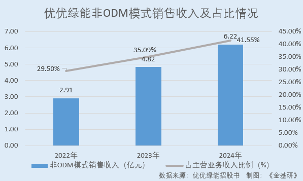 据招股书,2022-2024年,优优绿能的非ODM模式销售收入分别为2.91亿元、4.82亿元、6.22亿元,占主营业务收入的比例分别为29.50%、35.09%、41.55%。