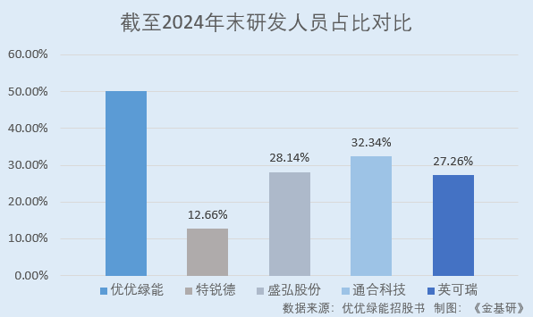 据招股书,截至2024年12月31日,优优绿能同行业可比公司特锐德、盛弘股份、通合科技、英可瑞的研发人员占比分别为12.66%、28.14%、32.34%、27.26%;研发人员中硕士及以上学历占比分别为10.17%、14.88%、11.68%、9.82%。