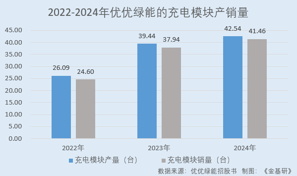 据招股书,2022-2024年,优优绿能的充电模块产量分别为26.09万台、39.44万台、42.54万台;销量分别为24.60万台、37.94万台、41.46万台。