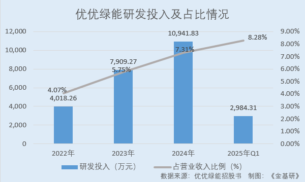 研发投入方面,2022-2024年及2025年一季度,优优绿能研发投入分别为4,018.26万元、7,909.27万元、10,940.68万元、2,984.31万元,占各期营业收入的比例分别为4.07%、5.75%、7.31%、8.28%。最近三年,优优绿能的研发投入CAGR为65.01%。