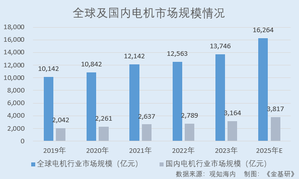 据观知海内数据,2019-2023年,全球电机行业市场规模分别为10,142亿元、10,842亿元、12,142亿元、12,563亿元、13,746亿元,预计2025年全球电机行业市场规模达到16,264亿元;国内电机行业市场规模分别为2,042亿元、2,261亿元、2,637亿元、2,789亿元、3,164亿元,预计到2025年国内电机行业市场规模达3,817亿元。