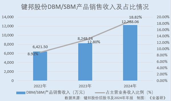 据招股书及2024年年报,2022-2024年,键邦股份的DBM/SBM产品销售收入分别为6,421.50万元、8,248.24万元、12,288.06万元,占当期主营业务收入的比例分别为8.92%、12.80%、18.82%。最近三年,键邦股份的DBM/SBM产品销售收入CAGR达38.33%。
