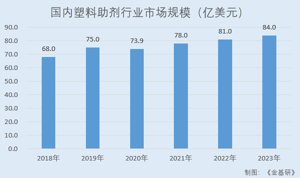 据普华有策数据,2018-2023年,国内塑料助剂行业市场规模分别为68.0亿美元、75.0亿美元、73.9亿美元、78.0亿美元、81.0亿美元、84.0亿美元,预计2026年将达97.81亿美元。