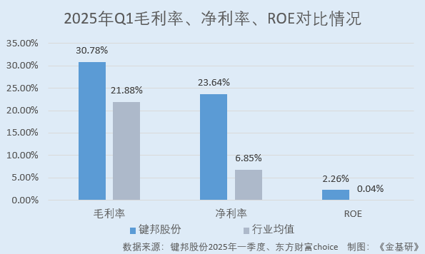 2025年4月28日,键邦股份发布2025年一季报,其毛利率及ROE高于行业均值,凸显盈利能力。