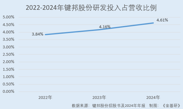 2022-2024年,键邦股份研发投入占营业收入的比例分别为3.84%、4.16%、4.61%,呈逐年上涨态势。