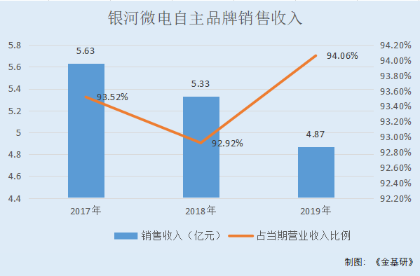 2017-2019年,银河微电来自自主品牌的销售收入分别为5.63亿元、5.33亿元、4.87亿元,占当期营业收入的比例分别为93.52%、92.92%、94.06%。