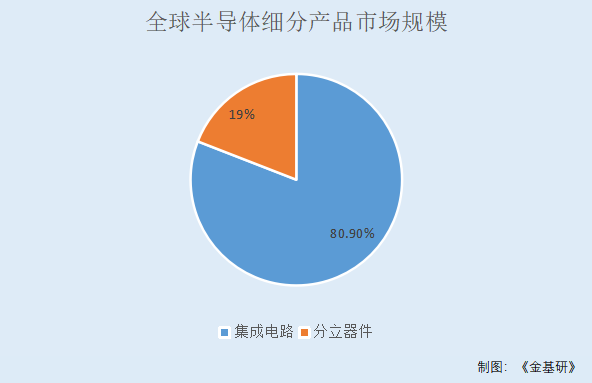 从市场规模来看,2019年全球半导体营收额约4,120.9亿美元,其中集成电路营收额3,334.6亿美元,占比80.9%,分立器件营收额786.4亿美元,占比19.1%。