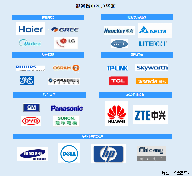 在长期发展过程中,银河微电形成了自身专注的业务领域和独特的竞争优势,在计算机及周边设备、家用电器、适配器及电源、网络通信、汽车电子、工业控制等领域得到了诸多知名龙头客户的长期认可,具备较强的客户认证优势。
