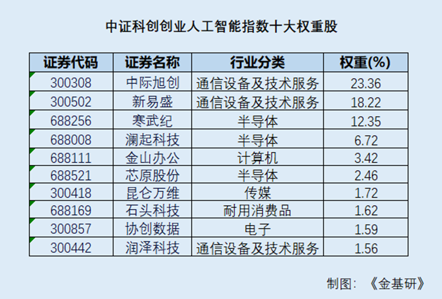 其中,指数前五大权重股分别为中际旭创、新易盛、寒武纪-U、澜起科技、金山办公,合计权重占比为64.08%。截至2025年12月4日,中际旭创、新易盛、寒武纪年内涨幅分别达335.76%、355.16%、108.05%。