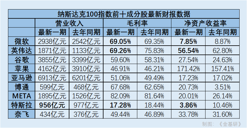 在财务表现上,前十成分股最新一期财报除特斯拉外表现良好,营业收入、毛利率、净资产收益率较去年同期均有增长。