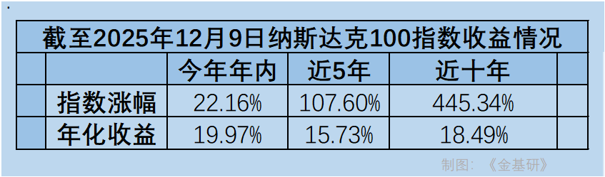在指数收益上,短期,截至2025年12月9日,纳斯达克100指数年内涨幅为22.16%。而在长期收益方面,该指数近5年和近10年的涨幅分别为107.6%和445.34%,对应的年化收益率则分别为15.73%和18.49%。
