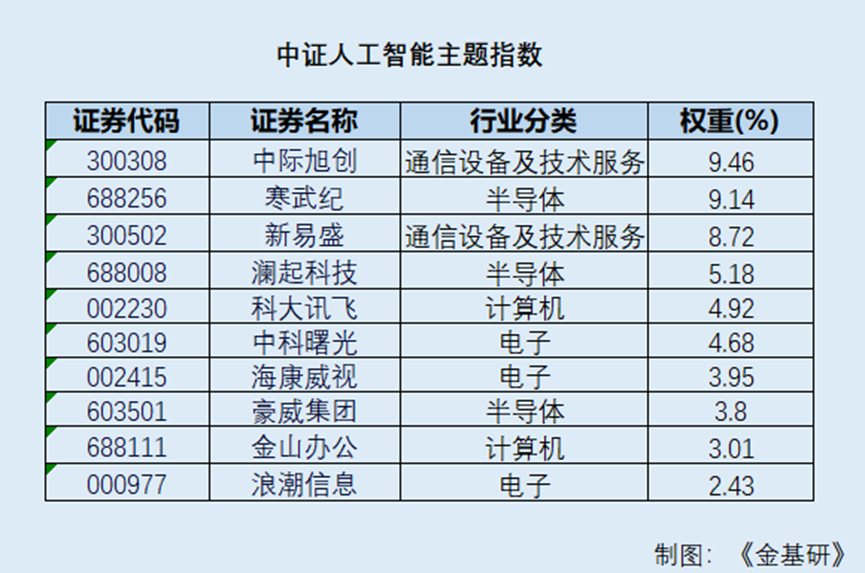 截至2026年1月13日,该指数前十大权重分别为中际旭创、寒武纪、新易盛、澜起科技、科大讯飞、中科曙光、海康威视、豪威集团、金山办公、浪潮信息,合计占比55.27%。