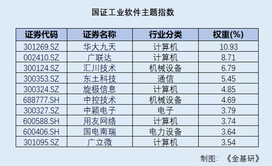 截至2026年1月21日,该指数前十大权重分别为华大九天、广联达、汇川技术、东土科技、旋极信息、中控技术、中颖电子、用友网络、国电南瑞、广立微,合计占比56.13%。