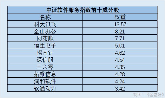 截至2026年1月29日,前十成股份分别为科大讯飞、金山办公、同花顺、恒生电子、指南针、深信服、三六零、拓维信息、润和软件、软通动力。其中前十成分股权重之和为59.95%,科大讯飞、金山办公、同花顺前三大权重分别为13.57%、8.21%、7.71%,合计权重接近30%。