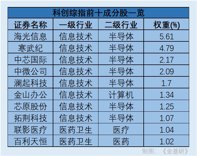 前十成分股中,前八位一级行业分类均为信息技术,进一步细分至二级行业,则八家企业中有六家属于半导体行业,两家为计算机行业。截至2026年3月4日,前十成分股分别为海光信息、寒武纪、中芯国际、中微公司、澜起科技、金山办公、芯原股份、拓荆科技、联影医疗、百利天恒。