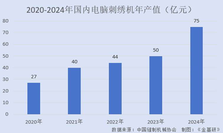 另据中国缝制机械协会数据,2020-2024年,国内电脑刺绣机年产值分别为27亿元、40亿元、44亿元、50亿元、75亿元。