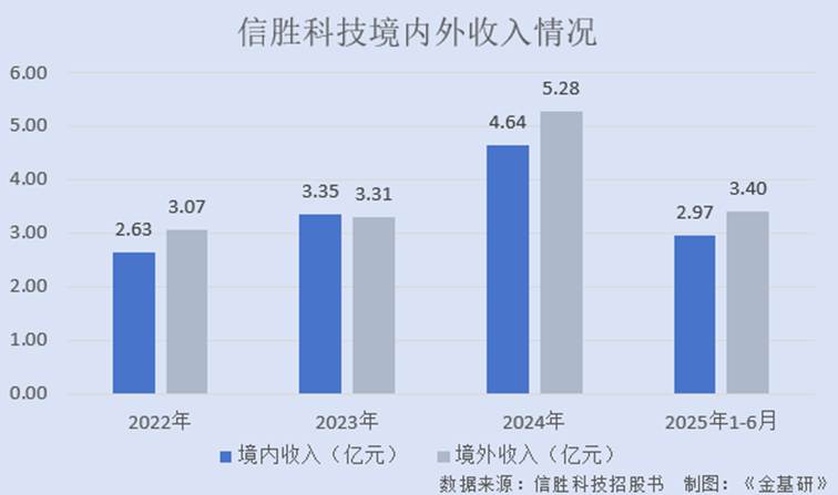 2022-2024年及2025年1-6月,信胜科技的境内收入分别为2.63亿元、3.35亿元、4.64亿元、2.97亿元,占主营业务收入比例分别为46.18%、50.29%、46.78%、46.63%;境外收入分别为3.07亿元、3.31亿元、5.28亿元、3.40亿元,占主营业务收入比例分别为53.82%、49.71%、53.22%、53.37%。