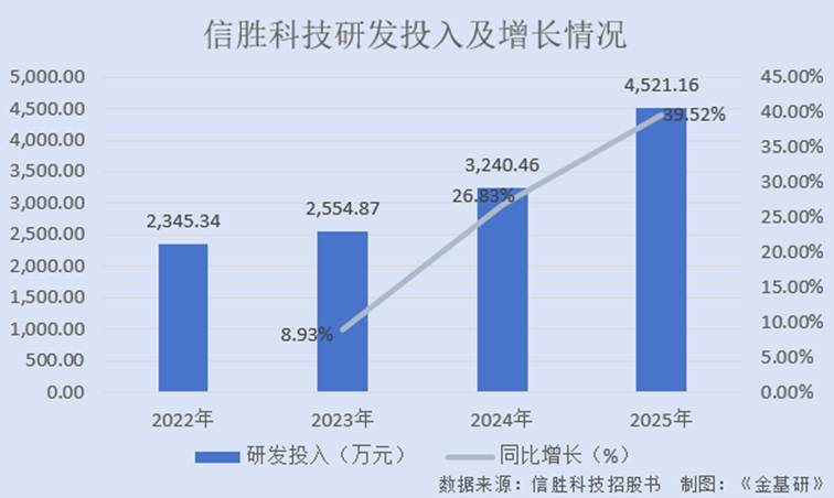 2022-2025年,信胜科技的研发投入金额分别为2,345.34万元、2,554.87万元、3,240.46万元、4,521.16万元,2023-2025年分别同比增长8.93%、26.83%、39.52%。