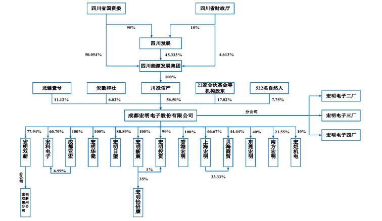 截至招股书签署日2026年3月5日,川投信息产业集团有限公司(以下简称“川投信产”)持有宏明电子56.50%的股份,为其控股股东;四川能源发展集团有限责任公司(以下简称“四川能源发展集团”)持有川投信产100%股权,为宏明电子的间接控股股东;四川省国资委为宏明电子实际控制人。