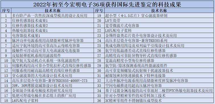 2022年初至今,宏明电子的多项技术成果通过了科技成果鉴定,分别达到了国际先进、国内领先等水平。其中,国际先进36项,国内领先28项,国内先进4项。